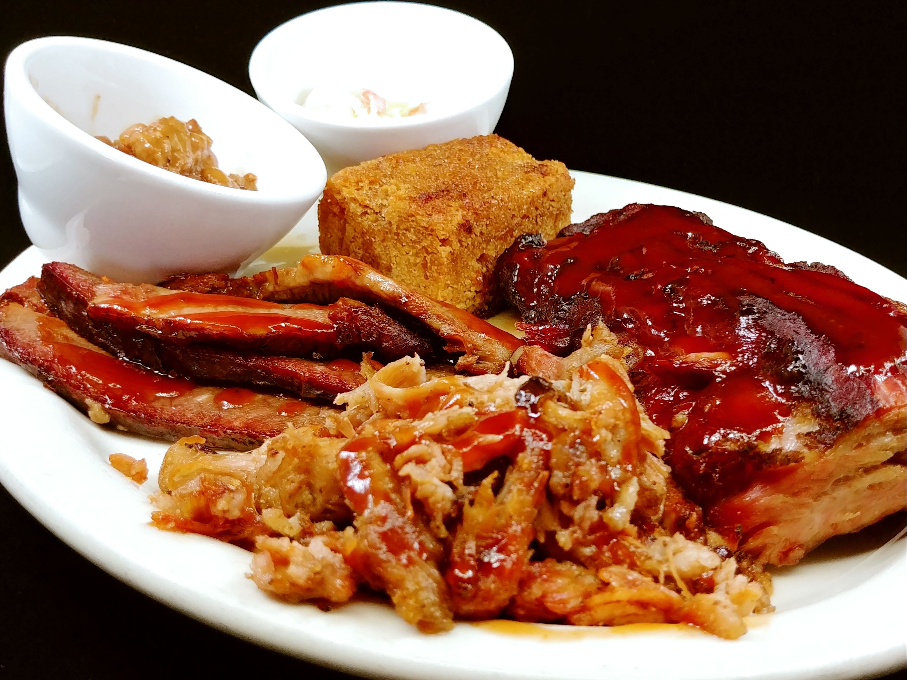 BBQ ribs, brisket, and tender smoked pork with smoked homemade beans, coleslaw and homemade cornbread. No substitutions