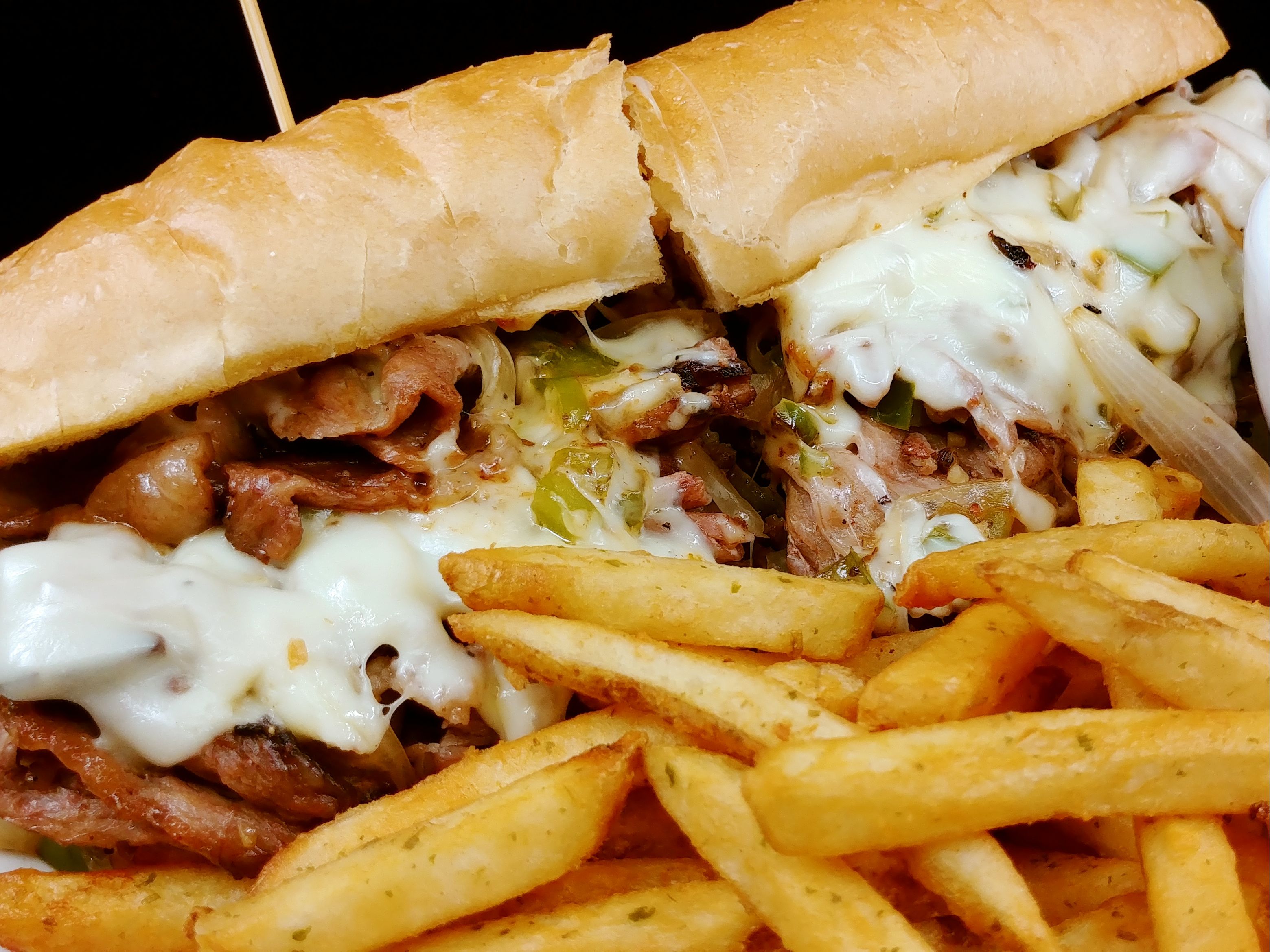 Sliced prime rib smothered in sautéed onions, green peppers with mozzarella cheese and side of homemade au-jus. Served on a hoagie roll
