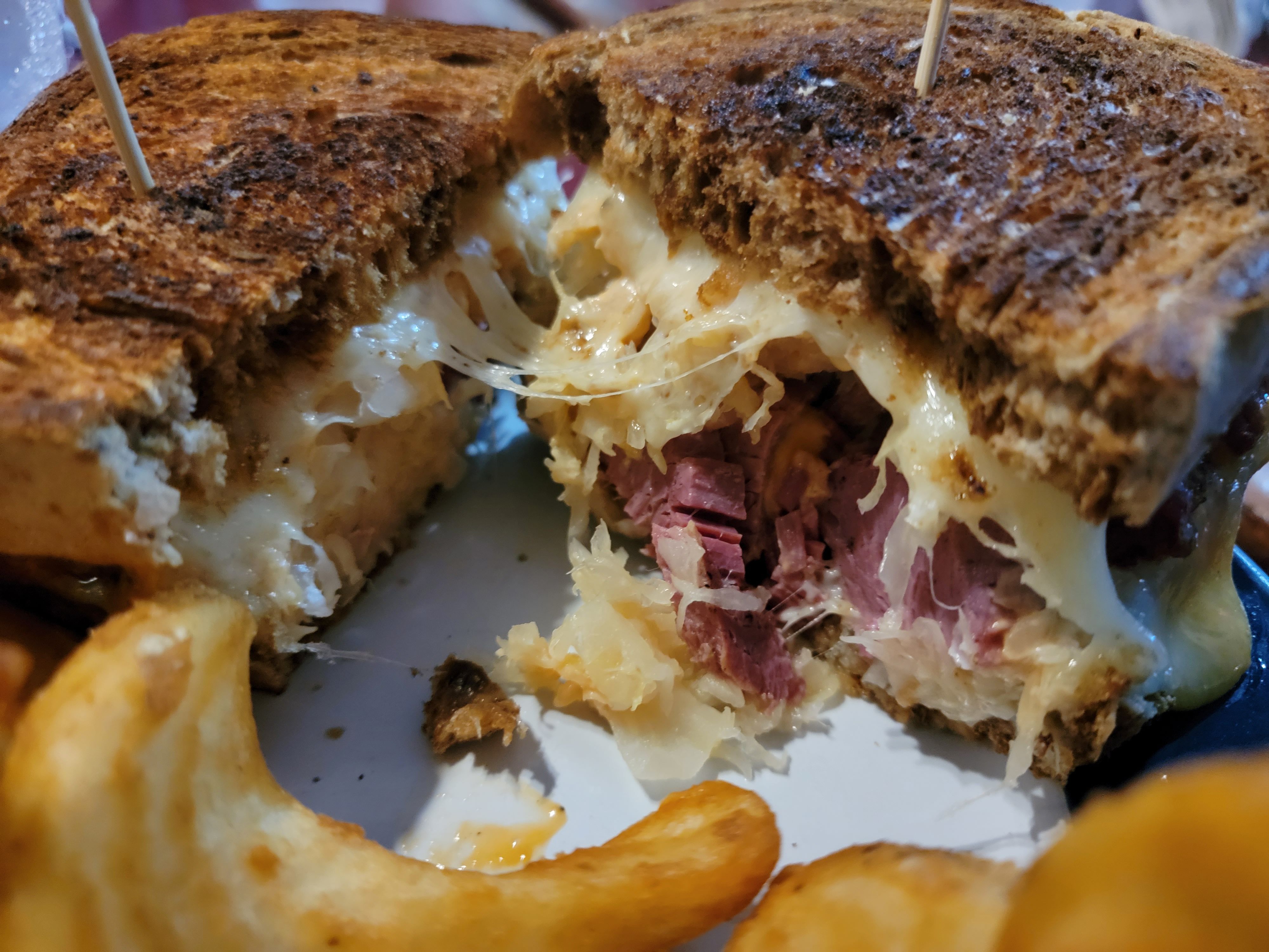 Slow cooked corned beef with sauerkraut, 1000 Island dressing and Swiss cheese served on grilled rye bread