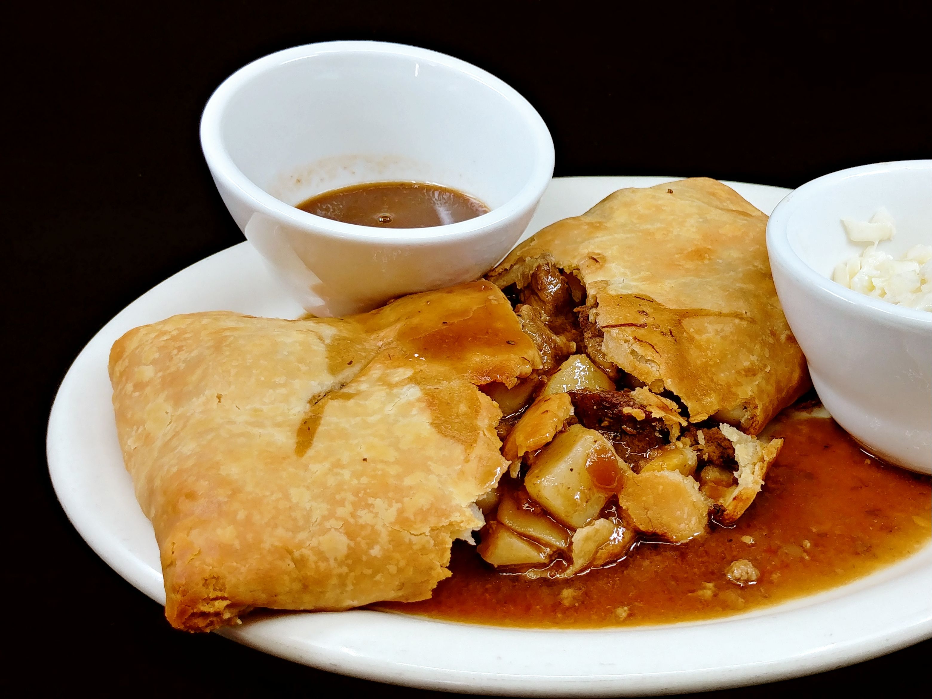 Made from scratch! Ground beef, diced potato, diced onion, and rutabaga folded inside a light and flaky pastry shell. Served with a side of beef gravy and coleslaw